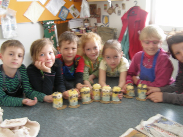 Jak se dařilo v keramickém kroužku prvňáčkům? Práce v keramické dílně děti moc bavila, moc se jim dařila a vyrobily velmi zdařilé výtvory. Nejlepší zábava byla, když vznikali "Mimoni".