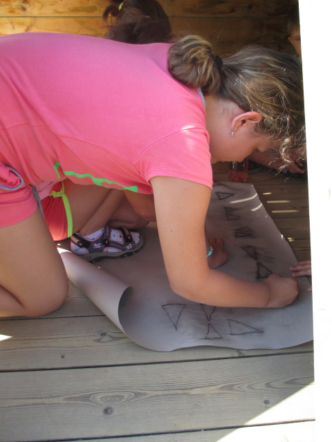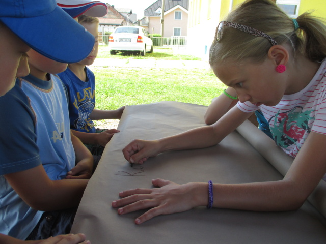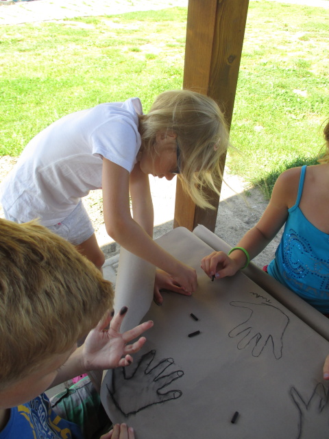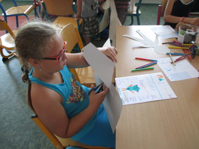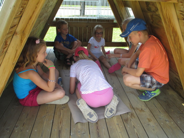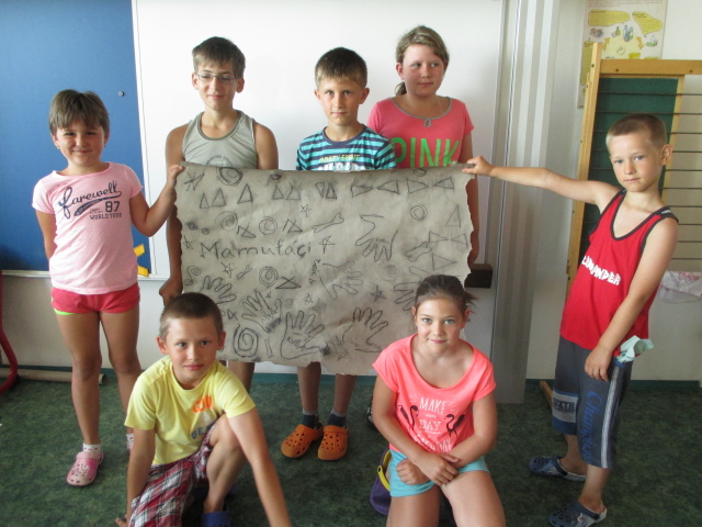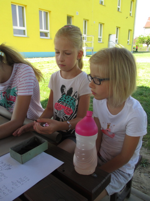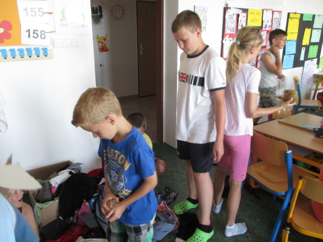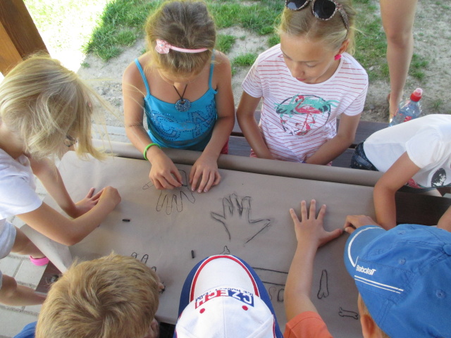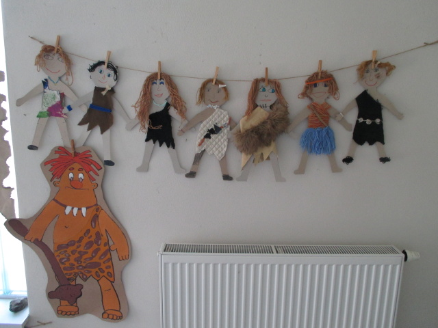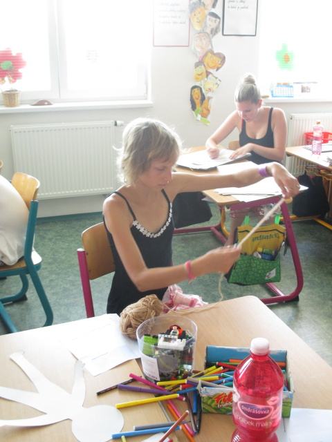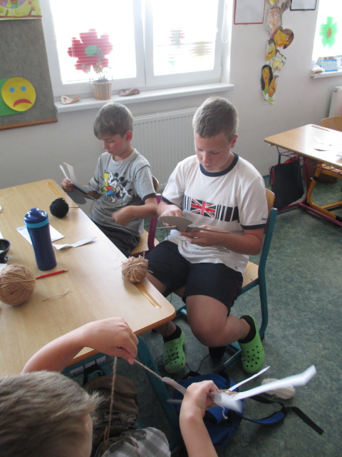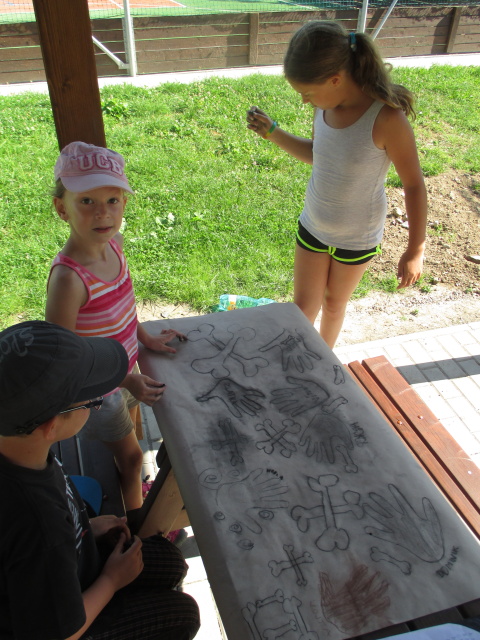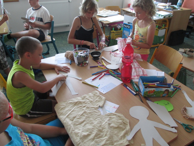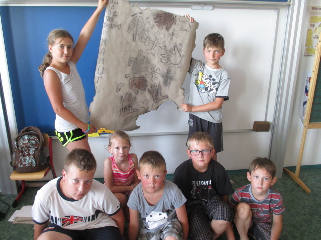 7. 7. - počasí nám opět přálo (možná až moc), proto jsme se zdržovali spíše v budově školy. Dětem to ale vůbec nevadilo, program byl bohatý. Nejdříve si vymyslely název své tlupy, podepsaly se jako správní pravěcí lidé. Pak pravěkého člověka vyráběly z papíru, látek a zbytků vlny. Všechny výrobky můžete shlédnout ve vestibulu školy.