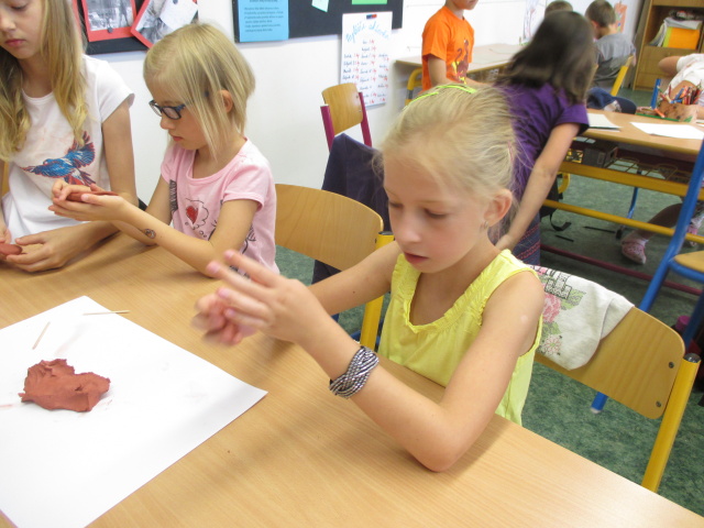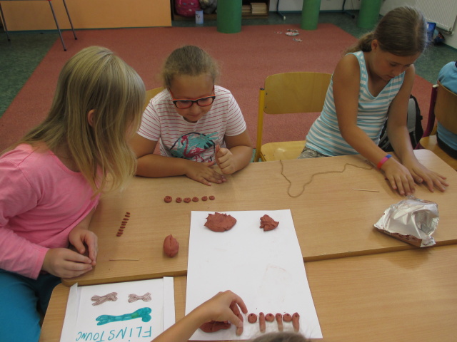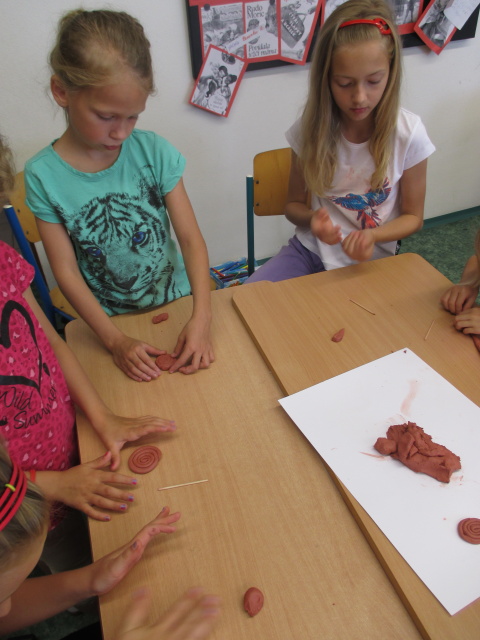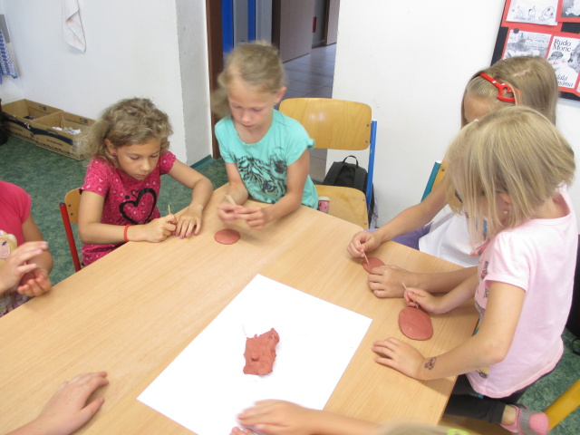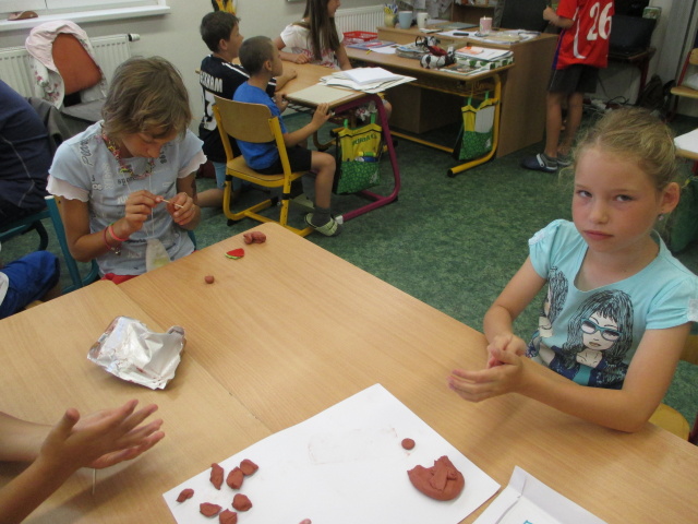 9. 7. - dnes byla na programu prezentace o pravěkých nálezech archeologů. Pak si děvčata zkusila vyrobit šperk ze samotvrdnoucí hlíny a chlapci kladívko. Moc je to bavilo, neuměli se od práce odtrhnout. Protože počasí bylo dobré, proběhly se děti na hřišti.
