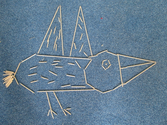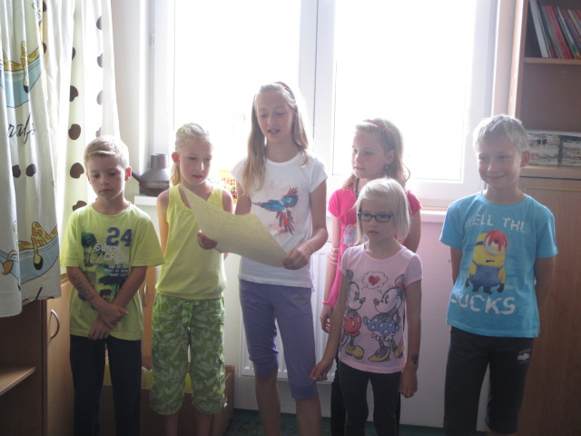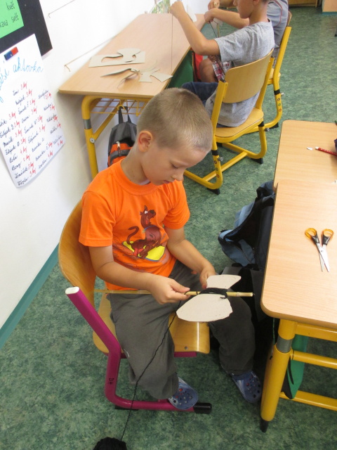 Po obědě jsme se podívali na část filmu "Osada havranů". Pak přišla na řadu práce v jednotlivých rodech a děti si zahrály na archeology a vymyslely název zvířete, které našly a zároveň jej vytvořily ze špejlí. Vše pak prezentovaly před ostatními rody.